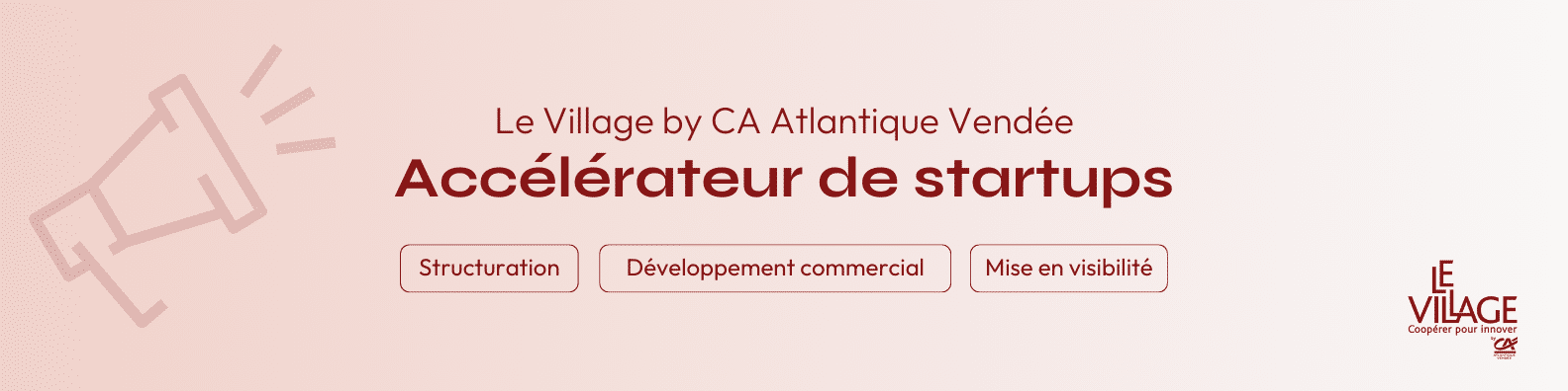 Le Village by CA est le réseau d’accélérateurs du groupe Crédit Agricole qui accompagne des startups et entreprises traditionnelles (PME, ETI, Grands Groupes) dans leur démarche d’innovation et de transformation. Le Village by CA Atlantique Vendée est implanté sur 2 territoires, en Loire-Atlantique à Nantes et en Vendée à La Roche sur Yon.